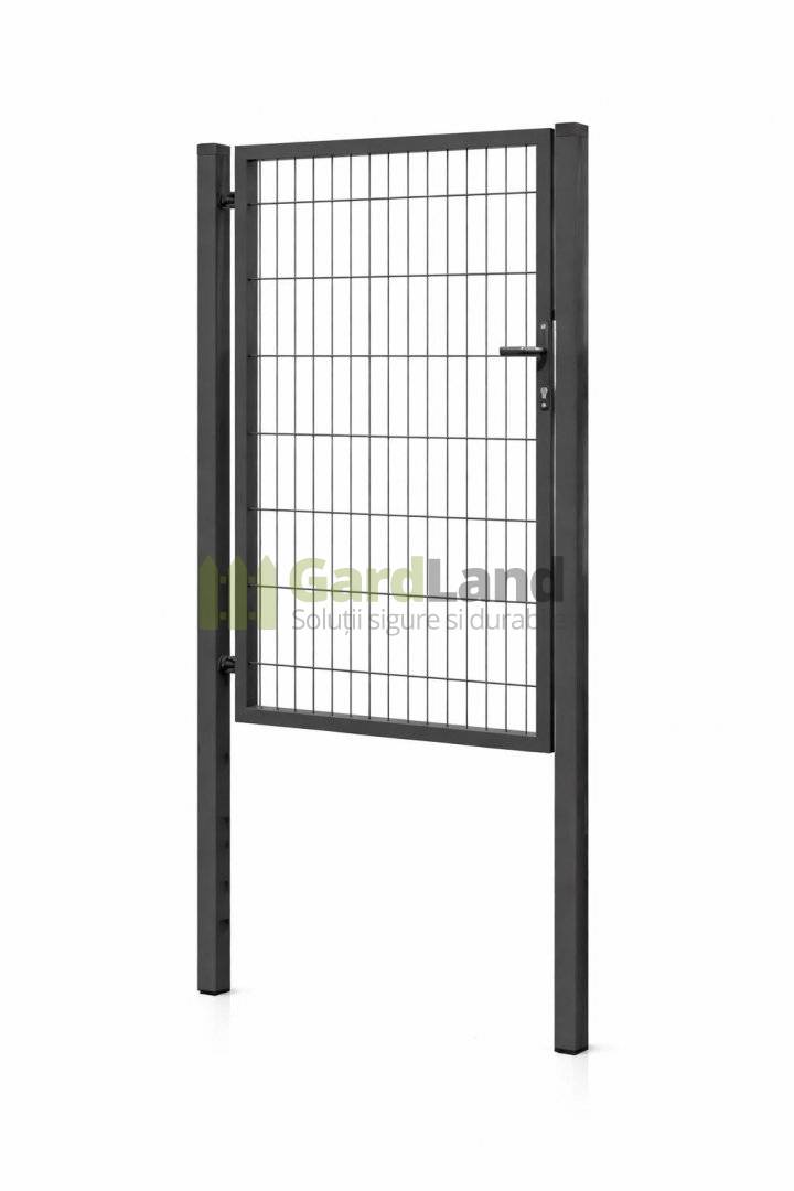 Poarta pietonală H 1,70 m gri antracit RAL 7016 este realizată din cadru metalic 40x40 mm, zincat și vopsit electrostatic, cu panou dublu fir și stâlpi solizi de 60x60 mm. Este echipată cu balamale reglabile și mâner cu yală inclus, oferind durabilitate și protecție excelentă împotriva coroziunii.