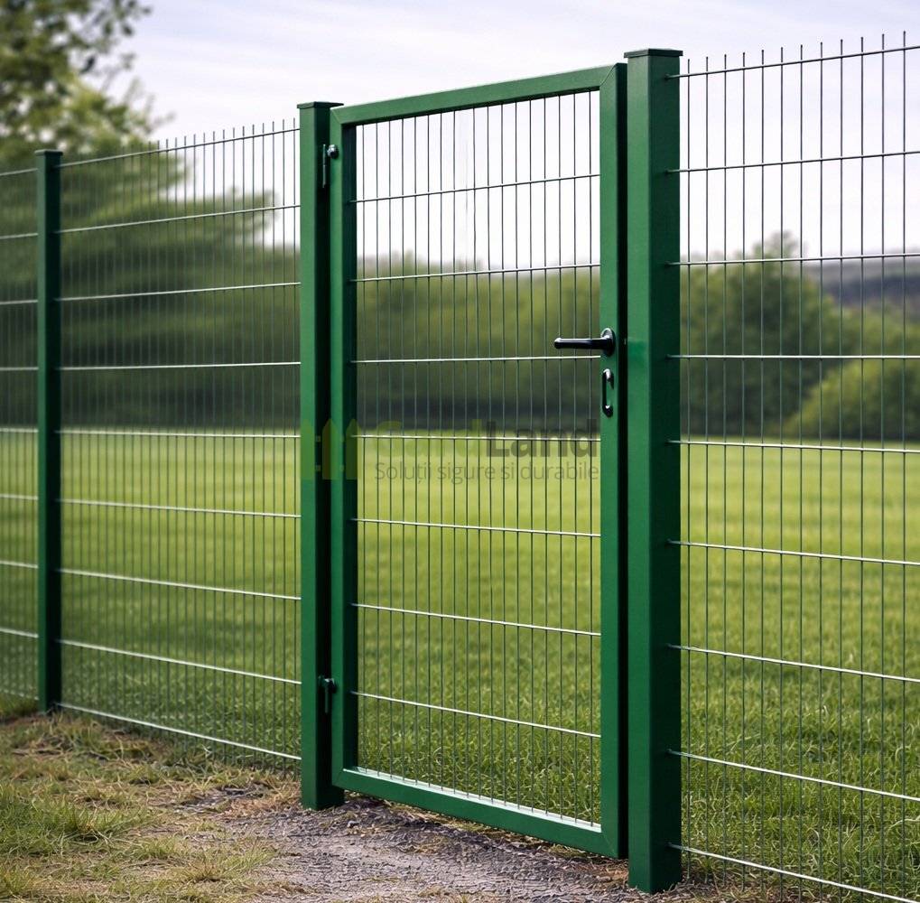 Poarta pietonală H 1,70 m verde RAL 6005 este realizată din cadru metalic 60x40 mm, zincat și vopsit electrostatic, cu panou dublu fir și stâlpi solizi de 80x60 mm. Este echipată cu balamale reglabile și mâner cu yală inclus, oferind durabilitate și protecție excelentă împotriva coroziunii.